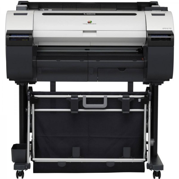 Plotter Canon imagePROGRAF iPF670 24", format A1, 5 culori, rezolutie max 2400x1200dpi, memorie 256MB, limbaje de imprimare: GARO (Graphic Arts language with Raster Operations), HP-GL/2, HP RTL, display LCD, interfata: USB 2.0, Ethernet, consumabile: PFI-107 (MBKx2, BK, C, M, Y), print head PF-04, maintenance cartridge MC-10. Accesorii optionale: printer stand ST-27, roll holder RH2 - 26. Se livreaza cu cartuse starter de 90ml.