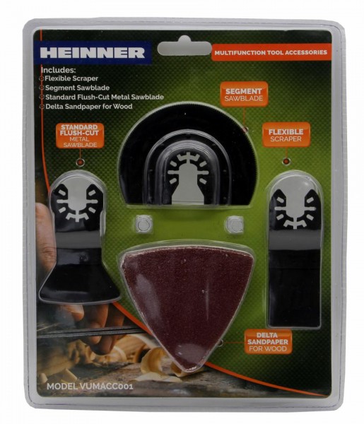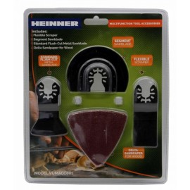 Set accesorii pentru unealta multifunctionala: razuitor flexibil - dimensiuni: 52x45mm (2-1/16"x1-3/4"), panza de ferastrau segmentata - diametrumetru: 87mm (3-7/16"), panza de ferastrau cu intrare directa in metal - dimensiune: 32mm (1-1/4"), hartie abraz