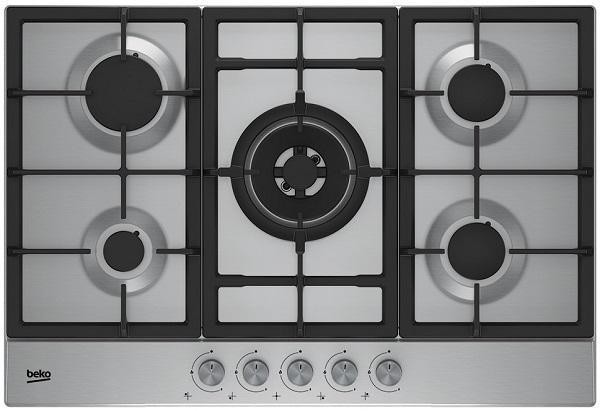 Plita incorporabila pe gaz BEKO HIAW75225SX, control butoane frontal, 4 arzatoare + 1 Wok, arzatoare cu eficienta ridicata, suport vase din fonta, siguranta plita, 75 cm latime, culoare butoane: inox cu capac cromat, culoare: inox