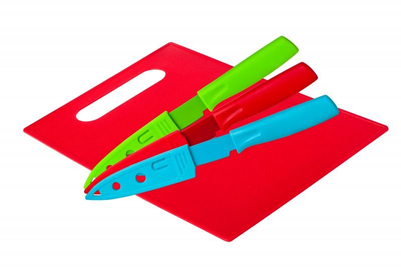 SET TOCATOR PP+ 3 CUTITE 9.5 CM CU TEACA ROSU, Dimensiune tocator :29.5x19.5x0.3 cm, Material tocator : PP, material cutit : otel in oxidabil acoperit cu strat antiaderent si maner din PP