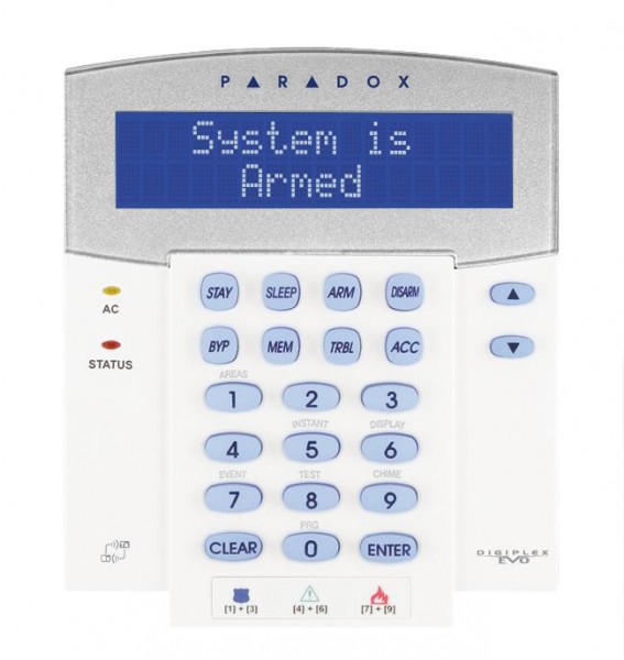 Tastatura Lcd Digiplex Paradox K641LX, Display Lcd Albastru, 32 de caracatere, cabalare pe 4 fire, suporta 192 zone si 8 partitii, tranceiver incorporat 433Mhz, acoperire radio 40m