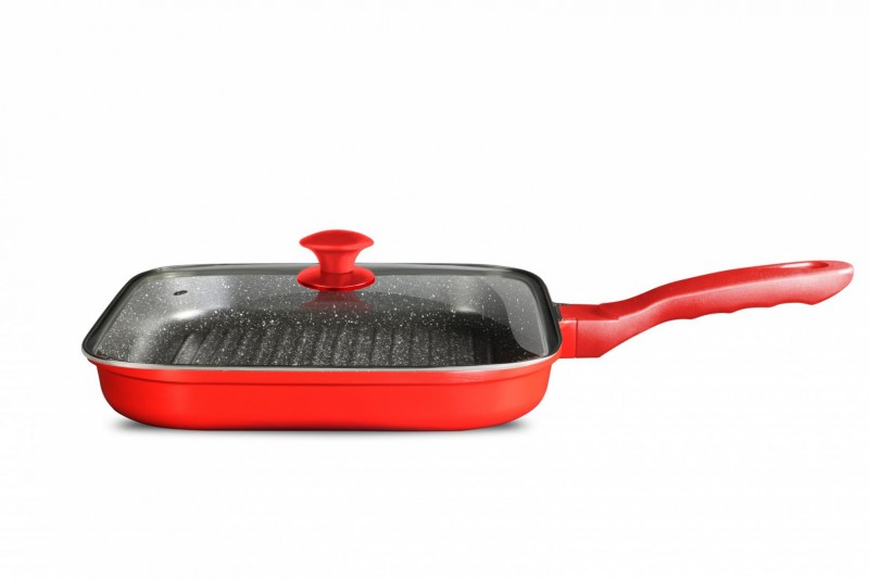 TIGAIE GRILL ALUMINIU + CAPAC , 28X4 CM, HOME CHEF; material: aluminiu manere: soft touch Acoperire non stick grosime: 4.5 mm baza inductie